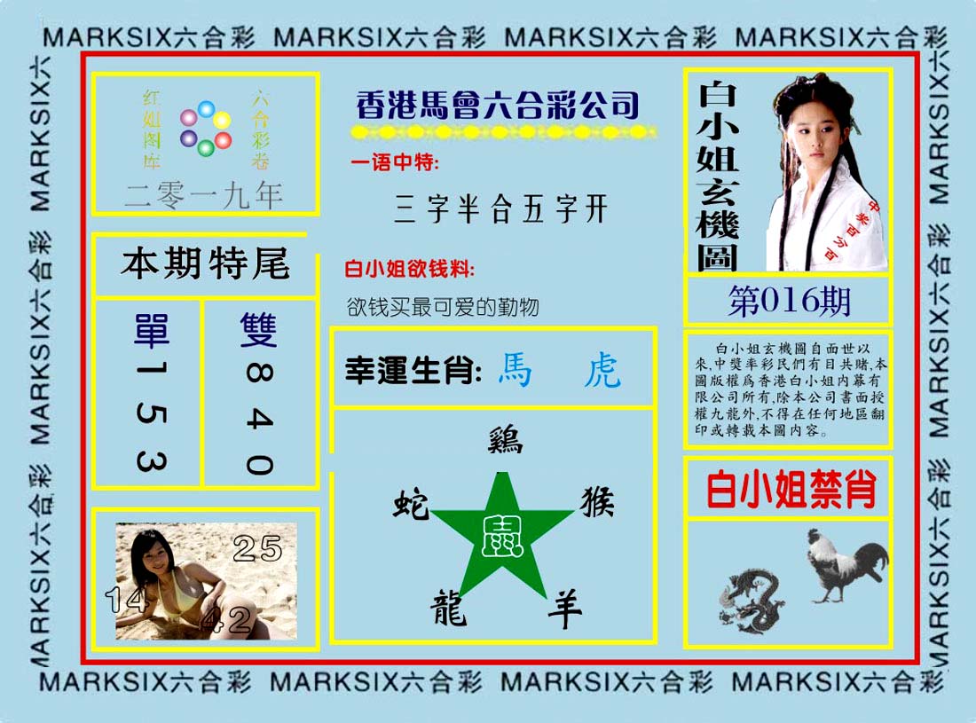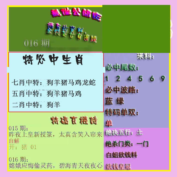 | 1601 | 马会双烧图 | 1602 | 马会禁尾图 | 1603 | 马会必中生肖 | 1604 | 内部禁肖禁尾 | |||||||||||||||||||||||||||||||||||||||||||||||||||