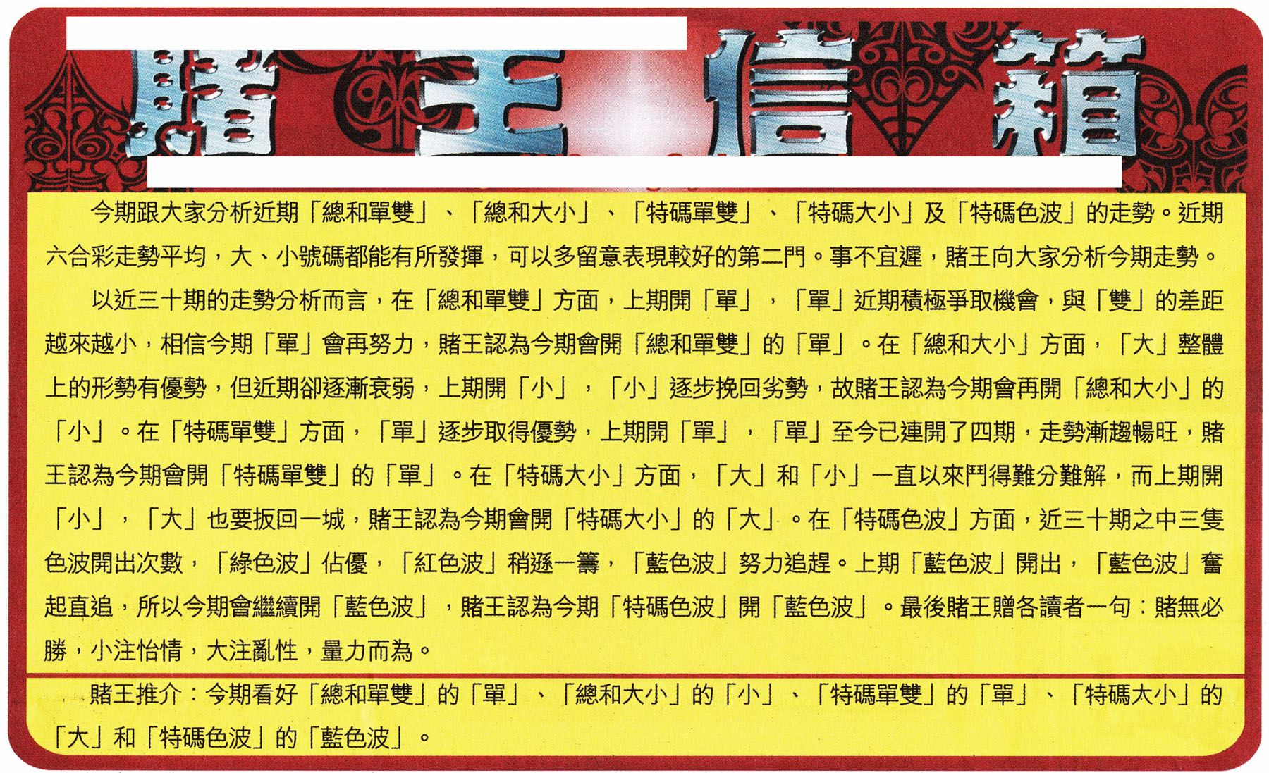 | 845 | 白姐金三角 | 846 | 白小姐波王 | 847 | 白小姐联合报 | 848 | 八卦天数 | |||||||||||||||||||||||||||||||||||||||||||||||||||