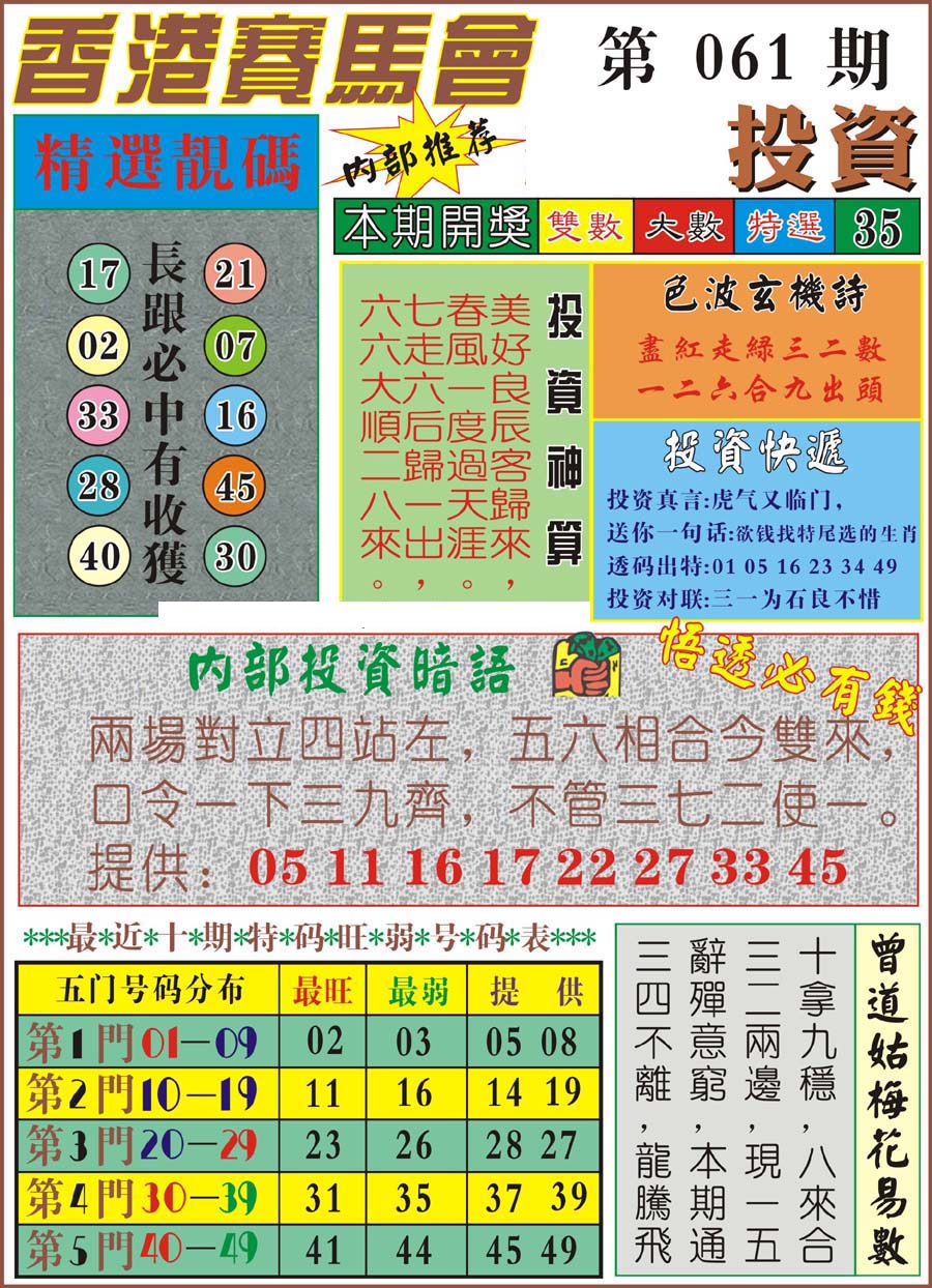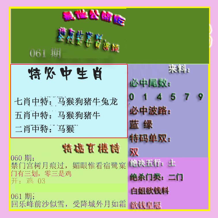 | 1601 | 马会双烧图 | 1602 | 马会禁尾图 | 1603 | 马会必中生肖 | 1604 | 内部禁肖禁尾 | |||||||||||||||||||||||||||||||||||||||||||||||||||