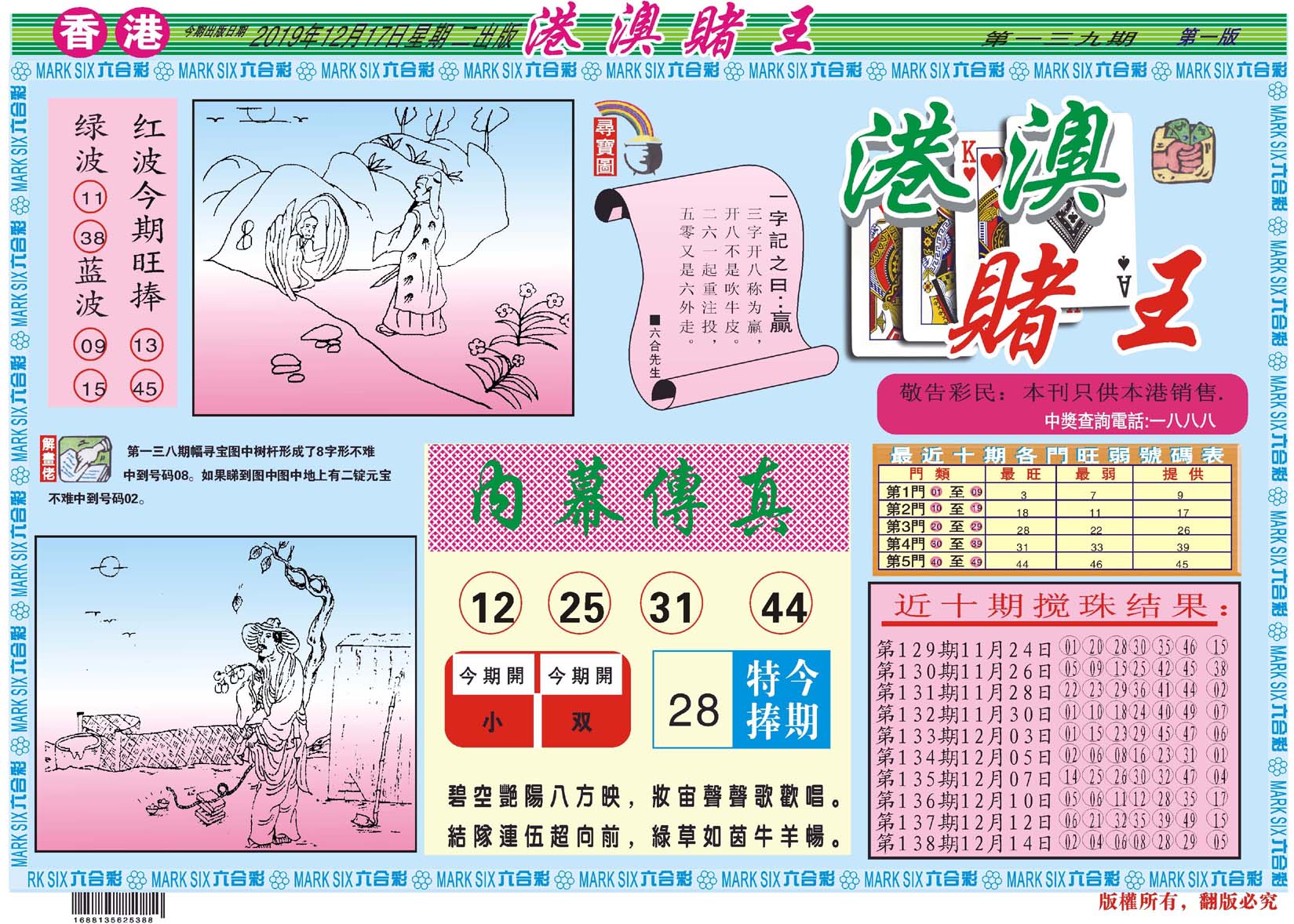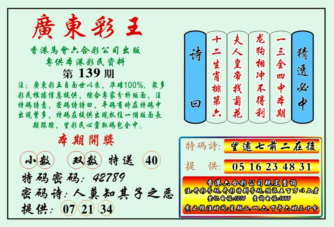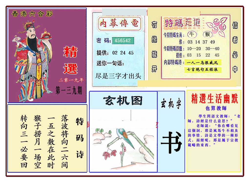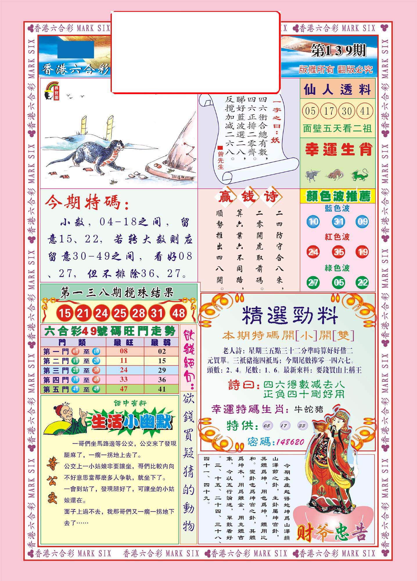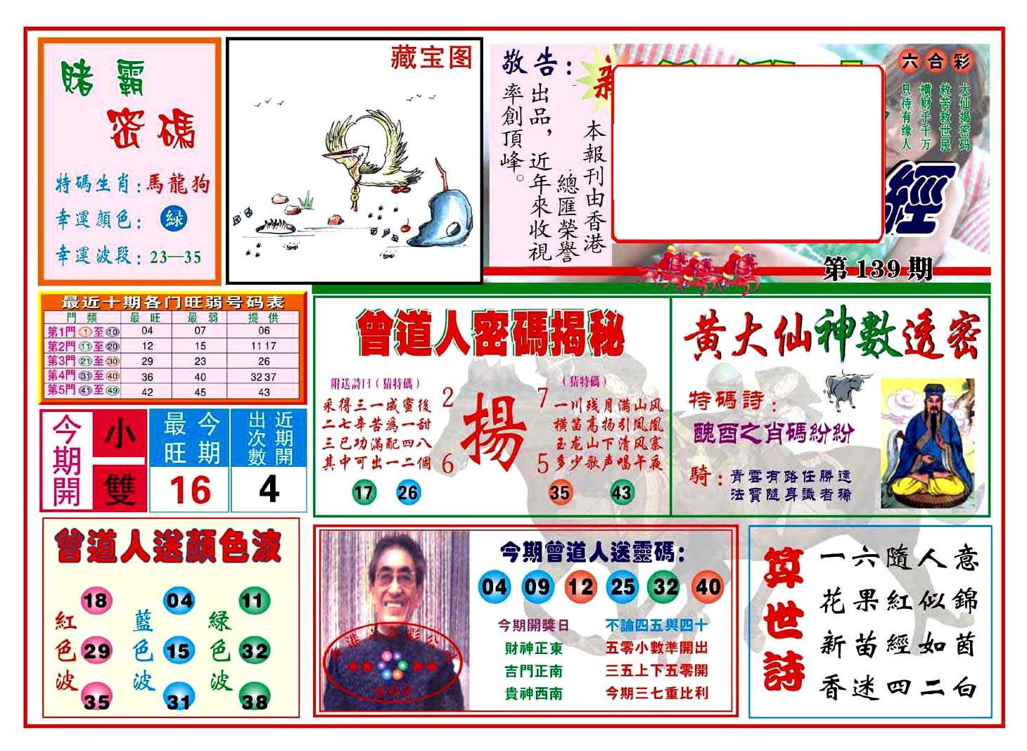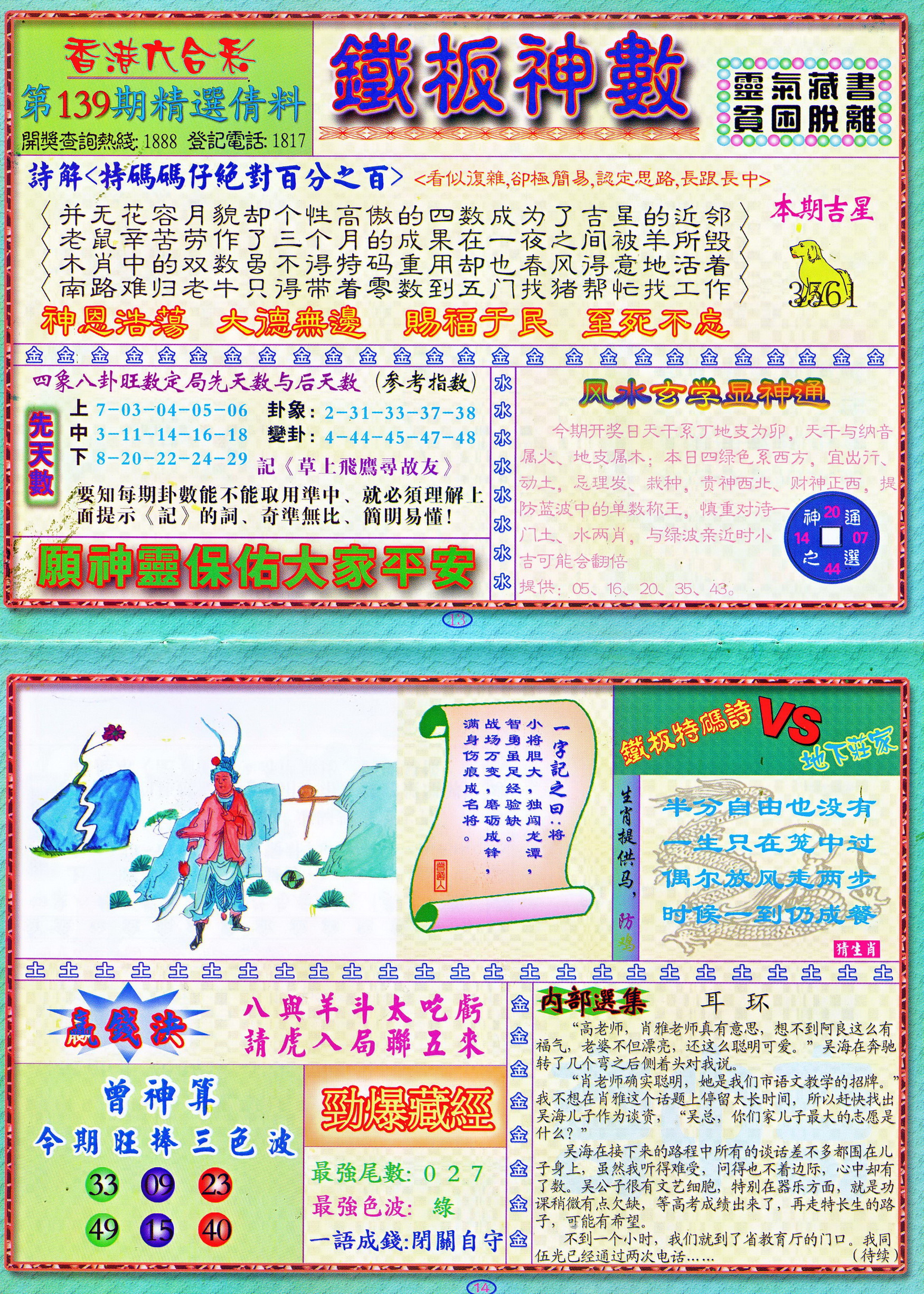 | 1765 | 黄大仙救世报 | 1766 | 香港马会专刊A | 1767 | 香港马会专刊B | 1768 | 赌王心经 |