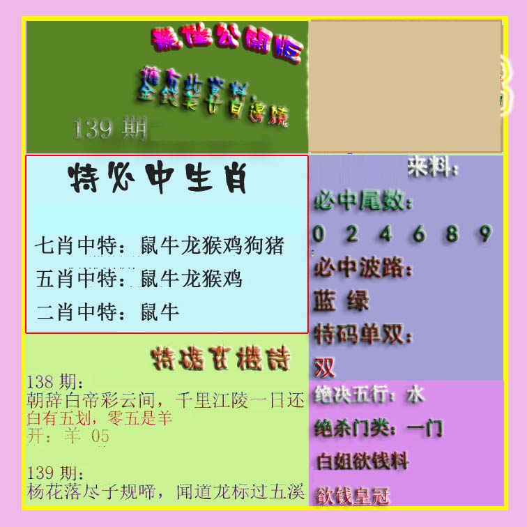 | 1601 | 马会双烧图 | 1602 | 马会禁尾图 | 1603 | 马会必中生肖 | 1604 | 内部禁肖禁尾 | |||||||||||||||||||||||||||||||||||||||||||||||||||